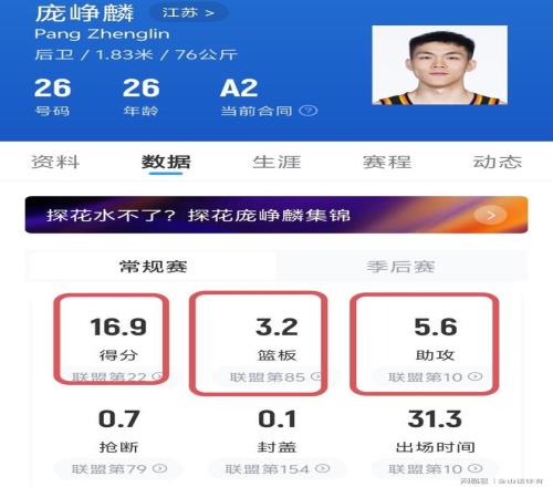 龐崢麟加盟CBA首秀,就砍下16分3籃板6助攻,而且全場0失誤。截止目前,龐崢麟代表江蘇隊打了15場比賽,在場均31分鐘上場時間里,為球隊貢獻16.9分3.2籃板5.6助攻。其個人場均得分,排在全聯(lián)盟第22位,個人場均助攻,排在全聯(lián)盟第10位。
