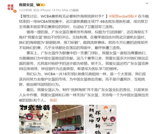 一場(chǎng)普通的WCBA常規(guī)賽卻因?yàn)橘惽昂?bào)遭到了爭議:廣東女籃在與武漢女籃的賽前海報(bào)內(nèi)容為“掃武除鶴”,沒想到卻被對(duì)方擊敗,遭遇三連敗。賽后,自媒體“我愛女籃”也對(duì)廣東女籃的海報(bào)內(nèi)容進(jìn)行了反擊。