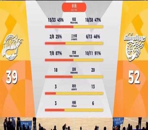 后半節(jié)有了奎因,廣東攻防兩端回歸正常,奎因接連制造搶斷連得6分,帶領(lǐng)廣東再打出一波4分鐘11-4,半場領(lǐng)先來到52-39,奎因半場17中6砍下16分5板2助5搶斷(別看投籃鐵,但正負值+20),薩林杰7中5得到13分6板5助,胡隊命中3記三分得到11分(焦泊喬王少杰表現(xiàn)最差)。