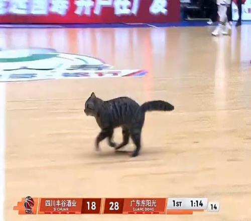 比賽第一節(jié)有一只很可愛的小貓咪誤入球場(chǎng)。