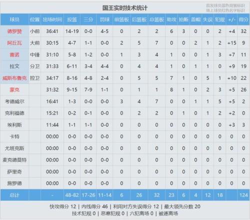 第四節(jié)威少和拉文命中率下降,湖人夾擊德羅贊。湖人自己進攻效率也不高,最后2分鐘,蒙克和阿丘瓦三分打進,國王領先到16分。湖人換下主力,布朗尼在垃圾時間三分2中2。全場結束,國王124-112擊敗湖人,背靠背連克火箭和湖人。