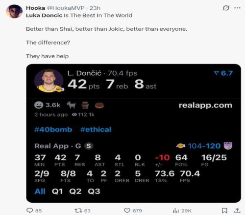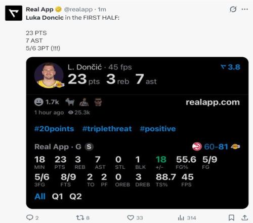 上半場湖人81分創(chuàng)造2024年后的新高,半場12個(gè)三分也是賽季新高,東契奇18分鐘,三分6中5拿到23分7助攻3籃板1蓋帽,除了三分球就是罰籃沒有任何一個(gè)兩分球。