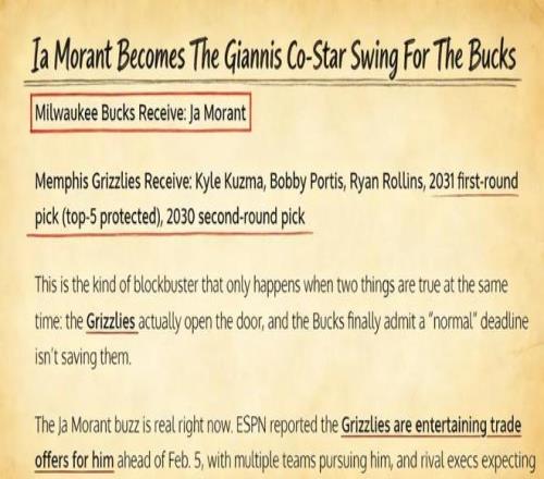 美媒《Fadeaway World》撰文建議,雄鹿應(yīng)該考慮打包送出庫茲馬、波蒂斯、羅林斯以及2031年的首輪簽(前5保護(hù))、2030年的次輪簽,從灰熊引入莫蘭特。