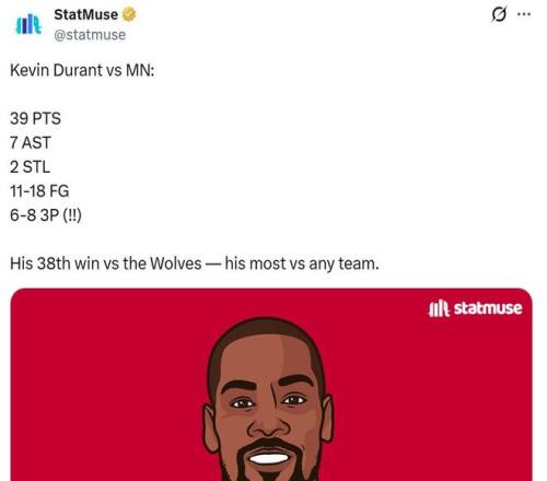憑借這樣的表現(xiàn),杜蘭特生涯至今已經(jīng)38次擊敗森林狼,創(chuàng)造其生涯擊敗球隊(duì)次數(shù)新高。