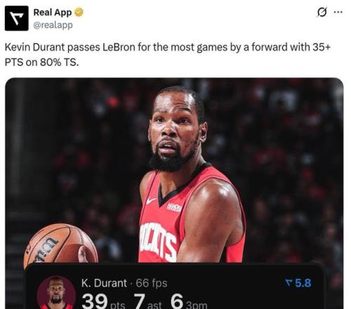 并且這是杜蘭特生涯第21次單場(chǎng)至少轟下35分且真實(shí)命中率80%+,成功超越詹姆斯(20次)獨(dú)占NBA鋒線歷史第一。
