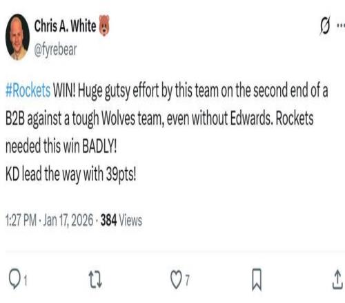 正如賽后火箭媒體人Chris A. White所說(shuō):“在背靠背第二戰(zhàn),火箭隊(duì)擊敗了強(qiáng)敵森林狼,全隊(duì)展現(xiàn)出巨大的勇氣和拼勁,杜蘭特轟下39分,拿下了一場(chǎng)急需的勝利?!?/p>