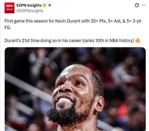 同時(shí)本場(chǎng)是杜蘭特加盟火箭之后,首次單場(chǎng)拿到至少35+5助攻+5三分,也是其生涯第21次,位列NBA歷史第十。