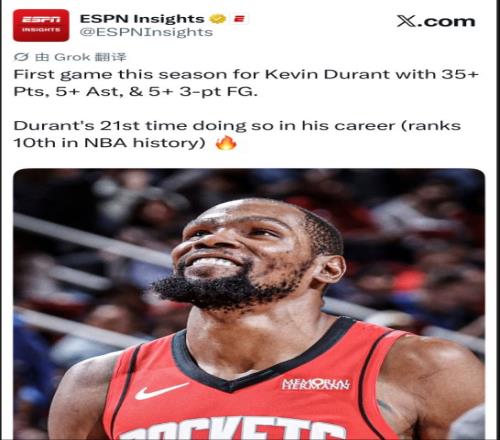 3.這是杜蘭特火箭生涯首次35+5+5三分的場次;