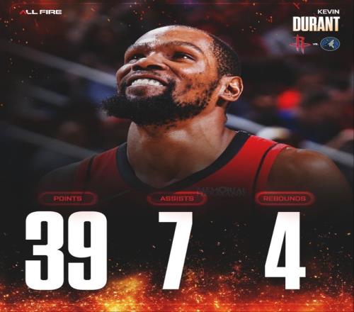 這場比賽后杜蘭特又創(chuàng)造多項(xiàng)紀(jì)錄:1.39分是杜蘭特火箭生涯新高;