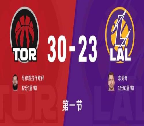比賽開始湖人主場第一攻,東契奇三分嘗試打鐵,巴恩斯拿下籃板快下助攻博伊爾斯空接暴扣,斯瑪特運過來中距離跳投得分,艾頓內線單打也有湖人4-2開局。雙方攻防轉換很快,不過失誤都很多,三個回合誰也無法得分。博伊爾斯,英格拉姆接連內線得分猛龍反超2分,東契奇單打阿巴基兩罰全中比分打成6-6平。巴恩斯頂投艾頓得分,詹姆斯傳球失誤,博伊爾斯反擊頂翻東契奇打成,裁判給了進攻犯規(guī),猛龍隨即暫停挑戰(zhàn)?;乜催^后挑戰(zhàn)成功了,改成東契奇阻擋博伊爾斯加罰命中11-6猛龍領先5分,東契奇上籃接連被帽拉拉維亞三分三不沾,巴恩斯中距離拔中,東契奇抱怨裁判吃到技術犯規(guī)英格拉姆技術罰球命中14-6。詹姆斯跳投止血,巴恩斯上下步回應猛龍,馬穆爆發(fā)連得12分東契奇對彪砍下8分湖人還是落后7分,暫?;貋黼p方各得2分,這樣首節(jié)打完湖人23-30落后7分!