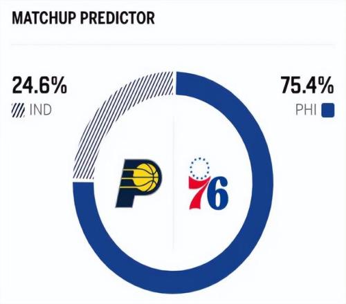 兩隊本賽季已有過一次交鋒,上一次交手步行者以10分之差不敵76人。賽前,美媒ESPN對本場比賽進行了勝率預(yù)測,步行者勝率僅有24.6% ,劣勢明顯,76人隊勝率則高達75.4% 。
