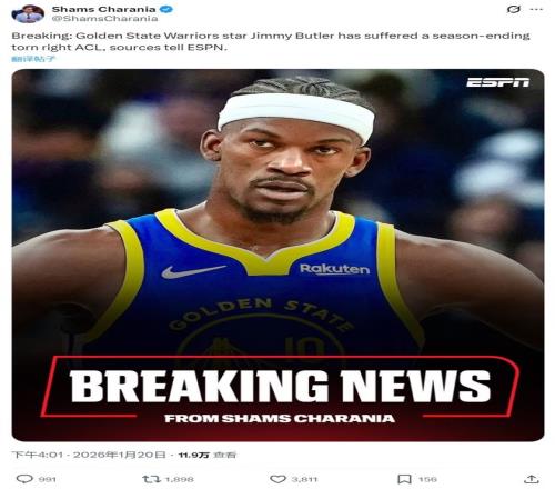 當(dāng)吉米·巴特勒在隊(duì)友攙扶下,無法用右腿承重、一瘸一拐地離開球場時(shí),他臉上擠出的那個苦笑,仿佛已經(jīng)預(yù)見了最壞的結(jié)果。不久后,據(jù)NBA權(quán)威記者Shams Charania報(bào)道,勇士隊(duì)球星巴特勒遭遇右膝前交叉韌帶(ACL)撕裂,本賽季正式報(bào)銷。這不僅意味著勇士隊(duì)失去了他們的第二核心,更可能徹底擊碎金州本賽季本就渺茫的爭冠希望。