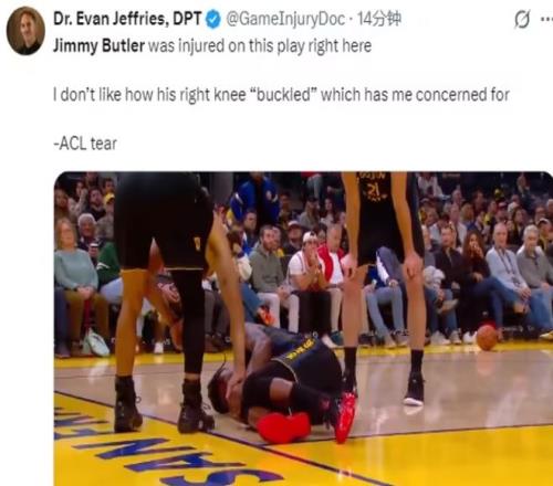 果不其然,比賽后僅僅不到3個小時,NBA知名記者Shams Charania確認了這一噩耗:勇士球星吉米·巴特勒遭遇右膝前十字韌帶撕裂,將缺席本賽季剩余的所有比賽!