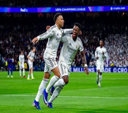 第27分鐘,皇馬打出快速反擊,維尼修斯高速插上后的傳中相當(dāng)舒服,姆巴佩輕松梅開二度,進(jìn)球后,皇馬兩大巨星相擁慶祝。