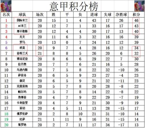 積分榜方面,國米和AC米蘭本周中補賽都贏了球,國米還是3分優(yōu)勢力壓AC米蘭領(lǐng)跑,那不勒斯補賽無力贏球被拉開差距,落后國米6分,少AC米蘭3分排在第3。亞特蘭大今天要是能贏球奪得4連勝的話,就能追上黑馬科莫,只是他們最后慘遭絕平,3連勝被終止,差科莫2分暫時還是排在第7。
