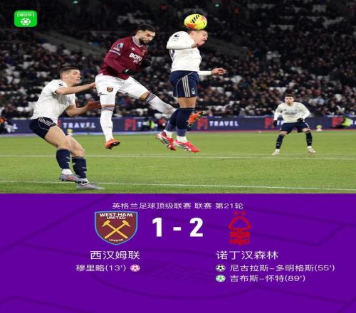 北京時間1月7日,英格蘭足球超級聯(lián)賽第21輪,西漢姆聯(lián)主場迎戰(zhàn)諾丁漢森林。比賽中,穆里略不慎自擺烏龍,為對手率先取得入球。隨后,埃利奧特-安德森送出助攻,尼古拉斯-多明格斯接應(yīng)破門,幫助球隊扳平比分。臨近比賽結(jié)束前,諾丁漢森林獲得點球機會,吉布斯-懷特主罰命中,完成逆轉(zhuǎn)。最終,諾丁漢森林客場2-1逆轉(zhuǎn)西漢姆聯(lián)。