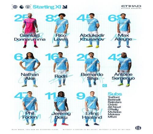 曼城首發(fā):25-多納魯馬、68-阿萊恩、45-胡桑諾夫、82-里科-劉易斯、6-阿克、47-福登、16-羅德里、20-伯納多-席爾瓦、11-多庫、42-塞門約、9-哈蘭德